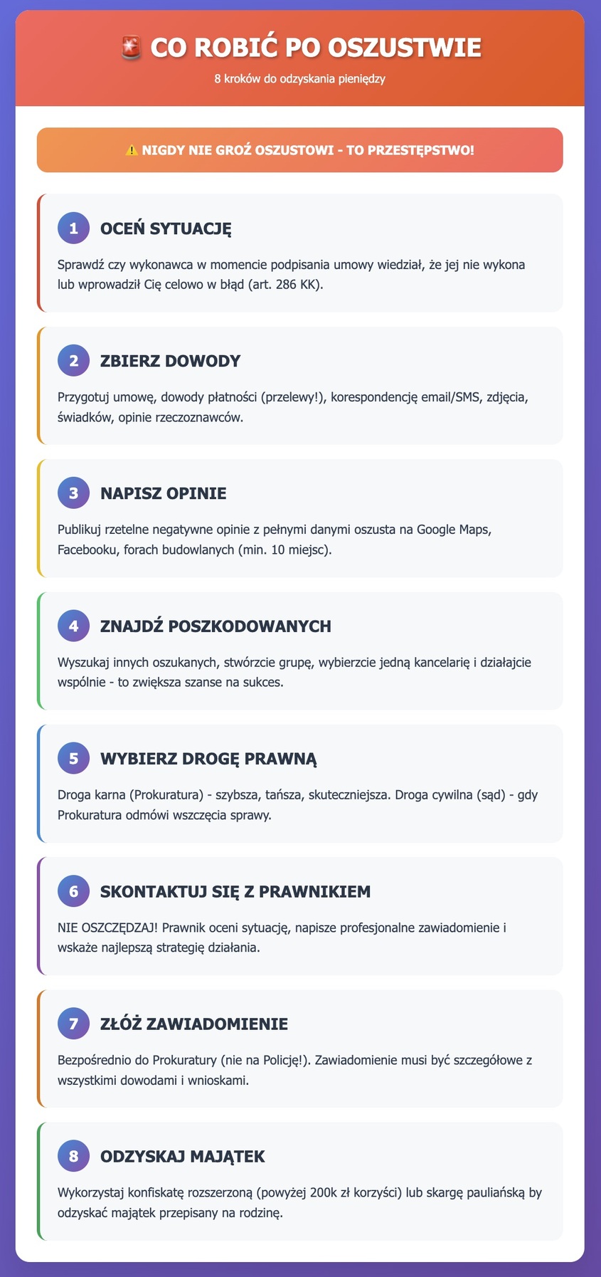 Dzisiejszy artykuł jest przeznaczony dla osób, które zostały oszukane przez wykonawcę lub firmę budowlaną i chcą wiedzieć, jakie kroki należy podjąć, aby nastraszyć i ukarać oszusta i odzyskać pieniądze.