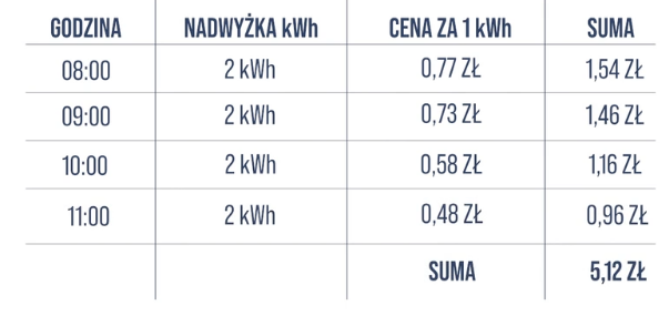 Jeżeli cena sprzedaży energii o godzinie 8:00 wynosi 0,77 za 1 kWh, to do wirtualnego depozytu trafiło 1,54 zł.